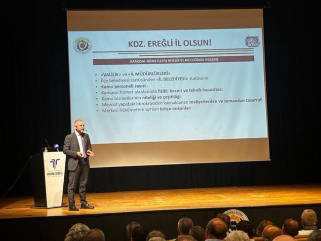 Vilayet olması lazım Devlet, vilayet olduğu zaman buraya Vali gelecek. Ve kendi bütçemizi, Devlet bize gönderecek. Vali Bey bunu yönetecek. İl genel meclis üyeleri Alaplı, Kandilli, Gülüç, Karadeniz Ereğli köylerimizin yollarını yapacak. Kanalizasyonlarını, su bağlantılarını yapacak. Merkezdeki hizmetleri yapılacak Yani kendi bütçemizi kendimiz harcama imkanına kavuşmuş olacağız. Bundan daha güzel bir şey olabilir mi? Karadeniz Ereğli, Alaplı, Gülüç, Kandilli, Ormanlı. Oralarda yaşayan insanlar arasında iki tane milletvekili seçilecek. Bu iki milletvekili işte bahsettiğim iyi şeylere, beldelere, merkeze hizmet götürmek için yarışacak. Milletvekillerimiz de bize hizmet edecekler. Mutlak suretle bu noktada birleşmemiz lazım.