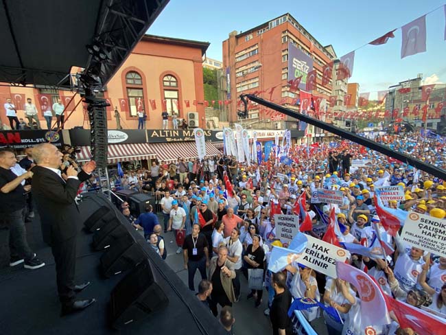 Bir aydır emekli maaşlarının bağlanma oranını konuşuyoruz. Şimdi alırsan yüzde 40 avantajlısın, yılbaşından sonra zarardasın. Böyle bir sistem olur mu? Bu alandan onun için sesleniyorum. Arkadaşlarımız bununla ilgili 1.5 aydır çalışma yaptılar yarın bitirecekler. Bizden haber almadan, sendikalarınızdan bilgi almadan emekli olmayın. Bu kabul edilebilir bir şey mi? Bu ucube sistemi biran evvel düzeltmek gerekiyor. Ben sizin yanınızdayım. Yoksulun, emekçinin, asgari ücretlinin, bu ülkeyi seven herkesin yanındayım.