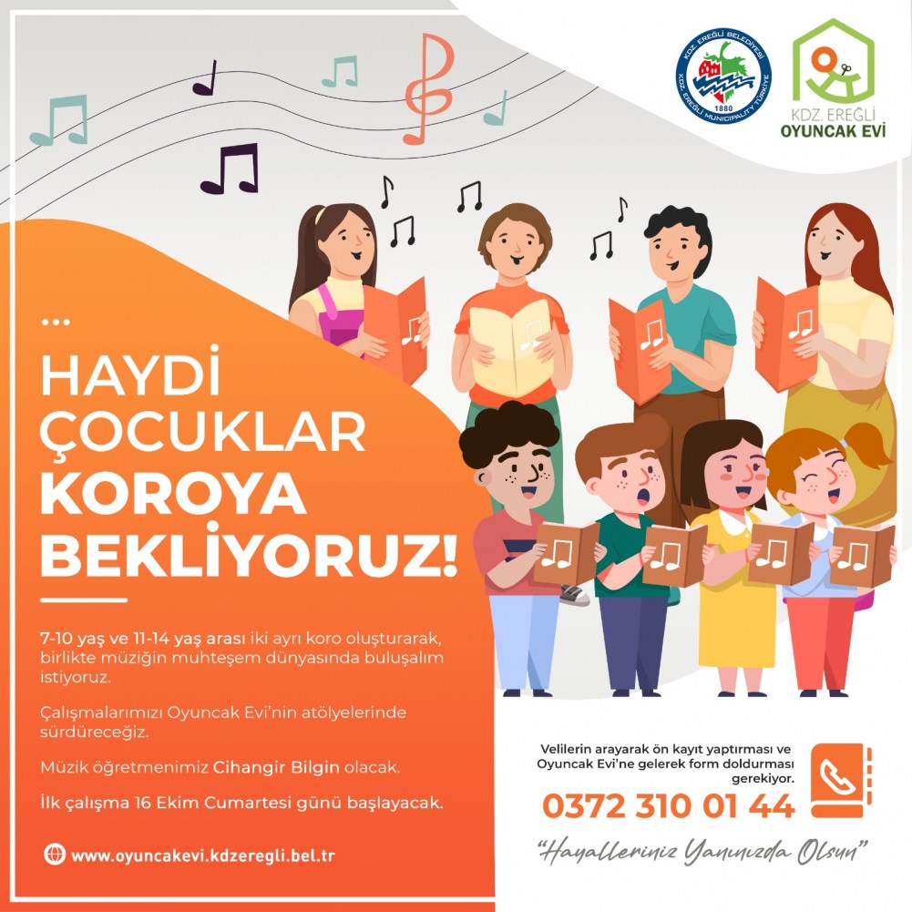 Kdz. Ereğli Belediyesi Oyuncak Evi, Çocuk Korosu kuruyor. 7-10 yaş ve 11-14 yaş arası iki ayrı koro oluşturulacak. Koro çalışmaları cumartesi günleri öğleden sonraları Oyuncak Evi’nde gerçekleştirilecek. Başvurular 15 Ekim’e kadar yapılabilecek. İlk çalışma 16 Ekim Cumartesi günü başlayacak.