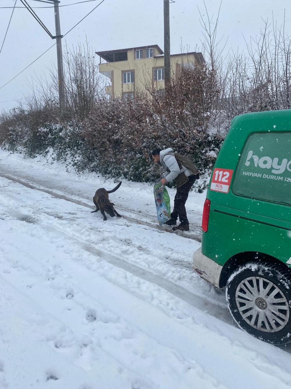 Zonguldak Emniyet Müdürlüğü'ne bağlı HAYDİ ekibi, il merkezindeki mahallelerde zorlu kış şartları nedeniyle sokak hayvanlarına mama dağıttı.