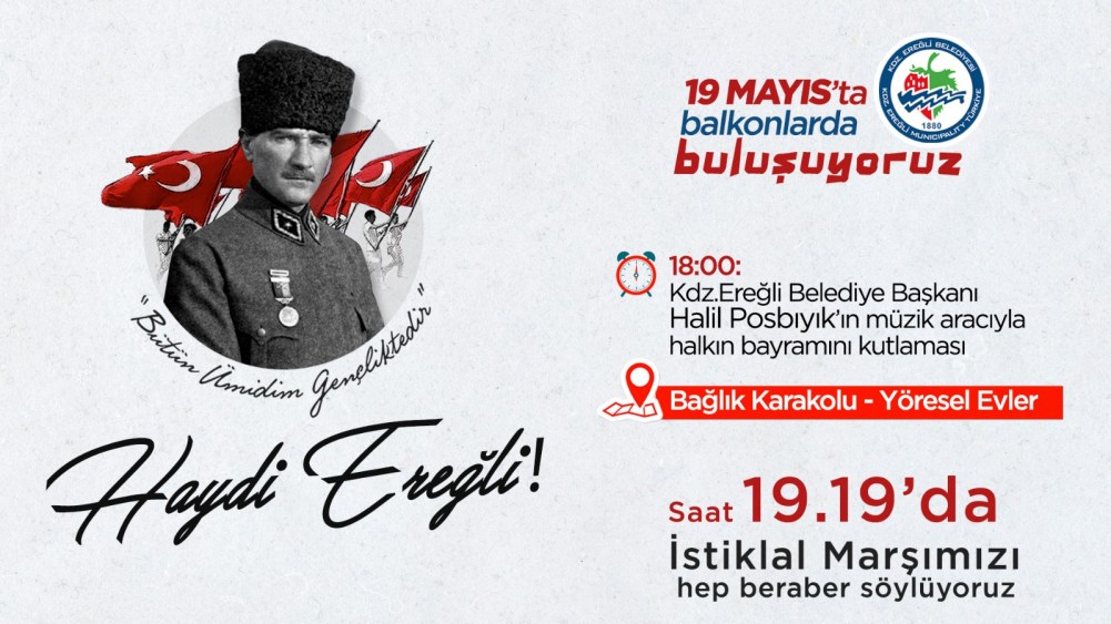 Kdz. Ereğli Belediye Başkanı Halil Posbıyık, 19 Mayıs Atatürk’ü Anma, Gençlik ve Spor Bayramı’nda müzik aracı üzerinden halkın bayramını kutlayacak. Saat 19.19’da balkonlarından ve pencerelerinden halkın katılımıyla hep birlikte İstiklal Marşı okunacak. Belediye hoparlörlerinden İstiklal Marşı tüm Ereğli’de yankılanacak.