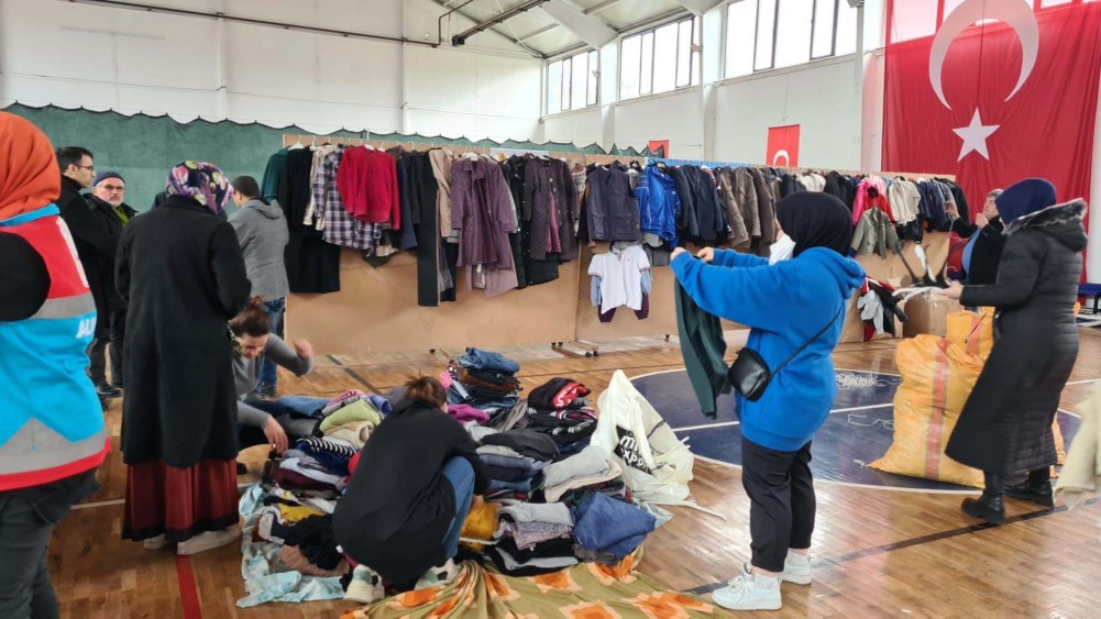 Zonguldak’ın Alaplı ilçesinde, Sosyal Yardımlaşma Vakfı iş birliği ile deprem bölgesinden gelen afetzedelerin giysi ve gıda ihtiyaçlarını karşılamak için hayır çarşısı kuruldu.