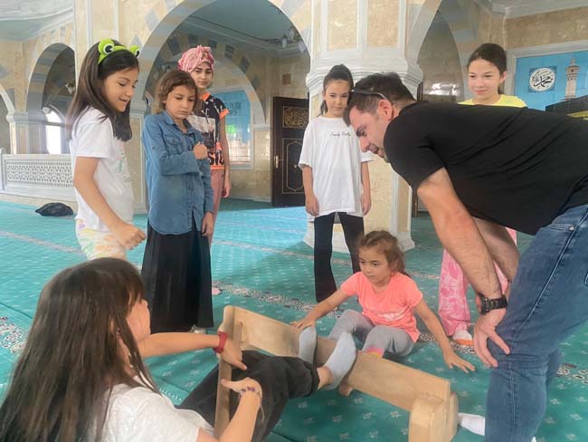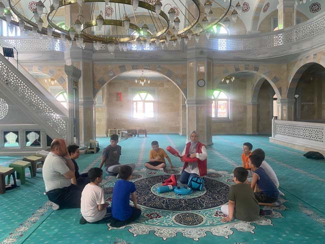 Zonguldak’ın Alaplı Gençlik Merkezi ve İlçe Müftülüğü işbirliğiyle düzenlenen kursa katılan öğrencilere” Okul öncesi din öğretimi projesi” doğrultusunda camide 7-16 yaş grubunda 20 çocuğa, oyunlarla Kur’an-ı Kerim öğretiliyor.