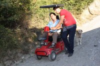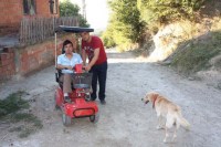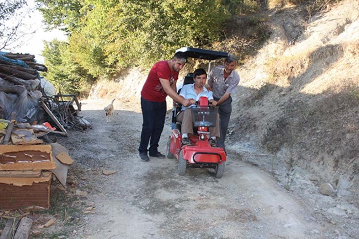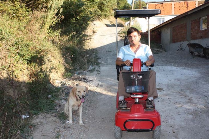 yaşayan Hakan Alkan, kendisine verilen akülü araba ile sokakta gezebiliyor.