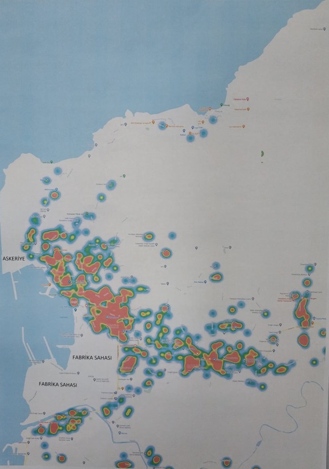 Bugün ( 30 Kasım Pazartesi) İlçe haritasına bakıldığında yerleşim yerleri olmayan fabrika sahası, askeriye ve ormanlık alanlar dışında çok sayıda bölgede kırmızıya yeni geçişler olduğu görülüyor.