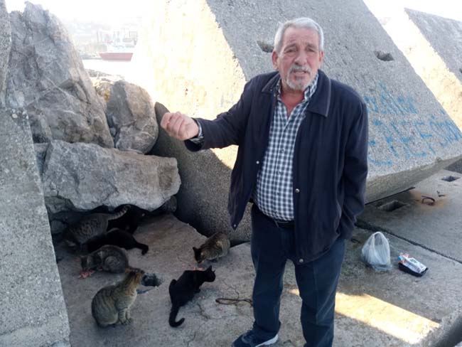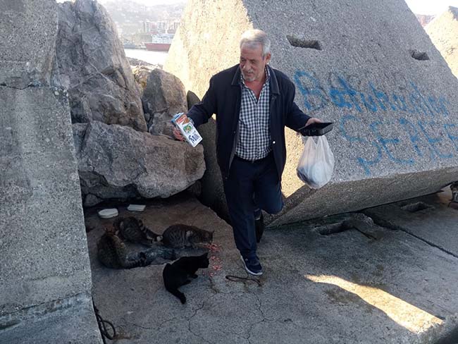 Zonguldak'ta hayvansever Bülent Gemicibaşı yıllardır her gün süt ve salam alarak liman arkasında bulunan 10 kedinin yiyecek ihtiyacını karşılıyor.