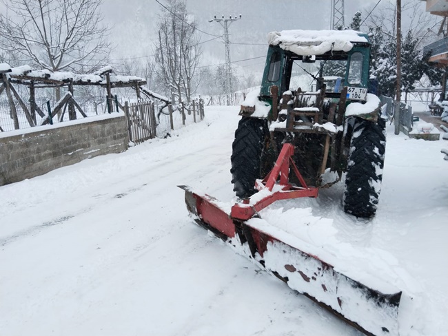 Ereğli’de sabah saatlerinden itibaren başlayan ve kısa sürede etkisini arttıran kar yağışı özellikle yüksek kesimlerde vatandaşlara zor anlar yaşatıyor. Kapanan köy yollarının İl Özel İdare ekiplerince açma çalışması devam ederken, Karakavuz köy muhtarı Bilgin İlik, yolda kalan seçmenlerine yol açmak için kolları sıvadı. kendisine ait traktörüne taktığı aparatı ile yolları açan muhtar İlik, sosyal medya hesabından yaptığı paylaşımında “Her şey devletten beklenmez. Vatandaş olarak bize de görev düşüyor afet durumlarında. Çok şükür olsun verdiğin nasip ettiğin her şeye rabbim” sözlerine yer verdi.