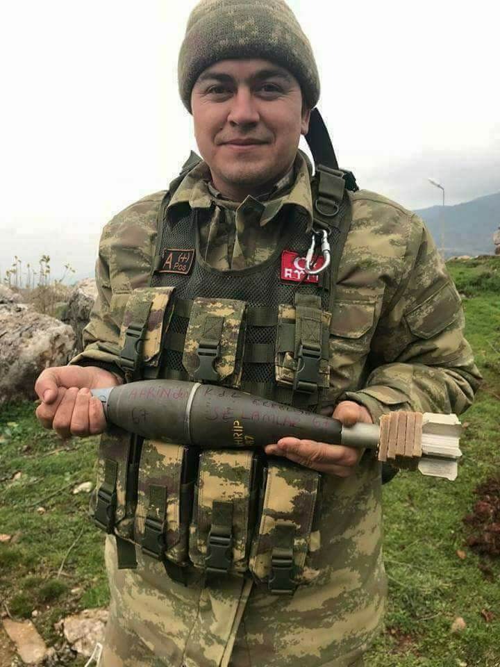 Suriye'nin Afrin bölgesinde düzenlenen operasyona katılan Zonguldak Ereğlili asker Ömer Bayram, top mermisinin üzerine yazdığı yazı ile Ereğlililere selam gönderdi. Yazıyı Sosyal medyada paylaşan Bayram Ereğlililerden ve bölge halkından dua istedi.