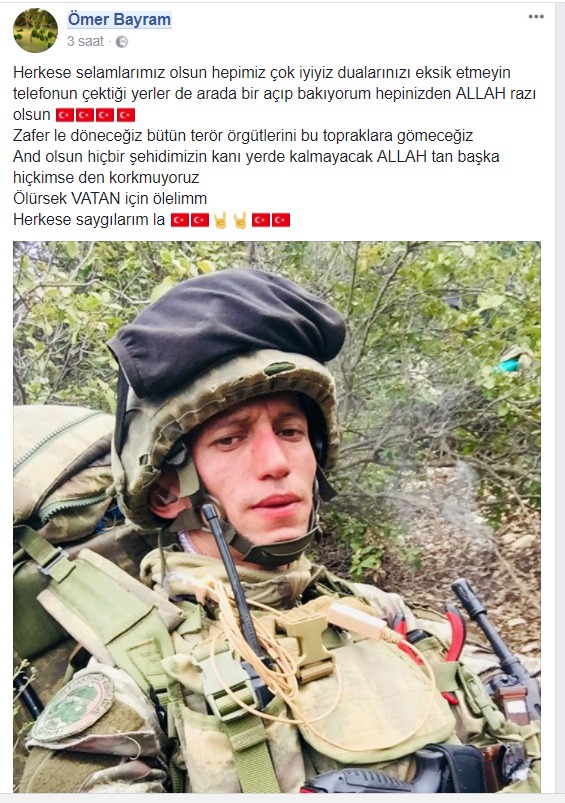 Türk Silahlı Kuvvetleri tarafından Suriye'nin Afrin bölgesine düzenlediği operasyona katılan Ereğlili askerlerden Ömer Bayram'dan selam geldi. Top mermisinin üzerine yazdığı yazıyı sosyal medyadan paylaşan Ömer Bayram Ereğlililerden ve bölge halkından dua istedi. Yayınladığı resmin ardından sosyal medyadan dua isteyen Bayram "Herkese selamlarımız olsun, hepimiz çok iyiyiz. Dualarınızı eksik etmeyin. Telefonun çektiği yerler de arada bir açıp bakıyorum, hepinizden Allah razı olsun. Zaferle döneceğiz. Bütün terör örgütlerini bu topraklara gömeceğiz. And olsun hiçbir şehidimizin kanı yerde kalmayacak. Allah' tan başka hiç kimseden korkmuyoruz. Ölürsek VATAN için ölelim. Herkese saygılarımla" dedi. Yapılan paylaşım karşılıksız kalmazken, Sosyal medyada fotoğrafı gören herkes dualarının Ömer Bayram ve Türk askerleri ile birlikte olduğu ifade edildi.