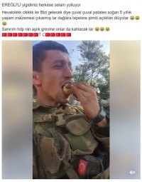 Afrin' de düzenlenen Zeytin Dalı operasyonuna katılan Ereğlili asker Ömer Bayram, YPG militanlarının püskürtüldüğü alanda yaptıkları arazi arama taramasında YPG'li teröristlerin 5 yıllık yaşam malzemesini ele geçirdi. Ele geçirilen Patatesleri közde pişirip yedikleri videoyu Ereğli' de ki arkadaşları ile paylaşan Ömer Bayram, yazıdğı yazıda "Hevalcikler bizi gelecek diye çuval çuval patates soğan ve 5 yıllık yaşam malzemesini dağlara tepelere çıkartmışlar. Şimdi açlıktan ölüyorlar. Sanırım HDP'nin aşlık grevine onlar da katılacak" diye yazdı.