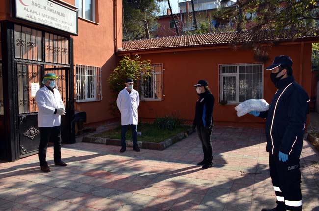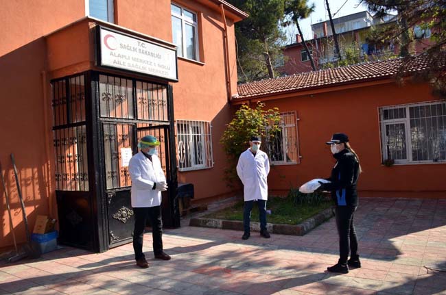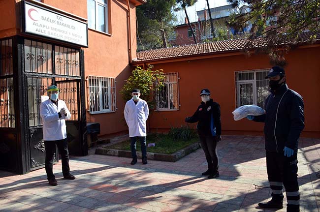 Alaplı Belediye Başkanı Nuri Tekin, salgından dolayı kullanımı artan maskeleri bu süreçte fedakarca çalışan sağlık çalışanlarına da ulaştırdıklarını belirterek, “1 Nolu Aile Sağlık Merkezi ve 2 Nolu Aile Sağlık Merkezlerinde görevli Aile hekimlerimize maskelerini teslim ettik. Fedakârca çalışan sağlık çalışanlarımızı ve sağlık merkezilerine muayene olmak için gelen vatandaşlarımızı maskesiz bırakmak istemiyoruz. Sağlık merkezilerine düzenli olarak maske dağıtımına devam edeceğiz. Tüm Alaplılı hemşerilerimizin başta kendi sağlıkları olmak üzere, ailesinin, yakınlarının, sevdiklerinin de sağlığını düşünerek hareket etmelerini rica ediyoruz. Bu doğrultuda bütün vatandaşlarımızın en başta evlerinden çıkmamalarını, eğer çıkmak zorundularsa mutlaka maske kullanmalarını önemle hatırlatmak istiyoruz. Koronavirüs salgınına karşı mücadele ettiğimiz bu günlerde el ele vererek bu zorlu süreci hep birlikte atlatacağız.” diye konuştu.
