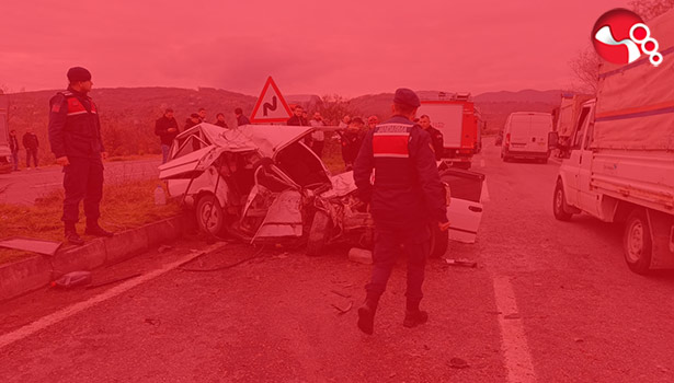 Zonguldak'ın Çaycuma ilçesinde kamyona çarpan otomobilin hurdaya döndüğü kazada 1 kişi hayatını kaybetti, 2 kişi ağır yaralandı.