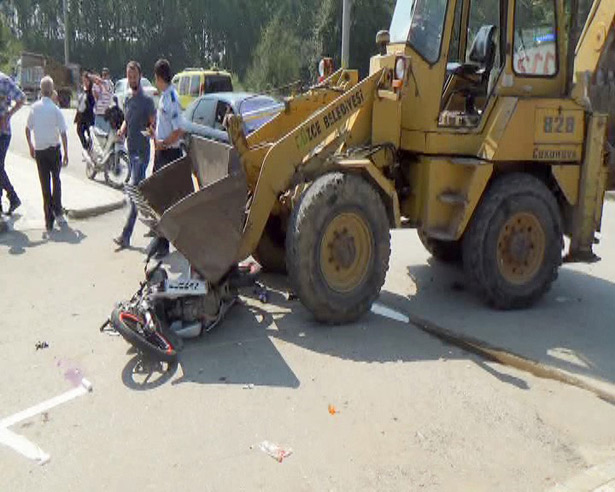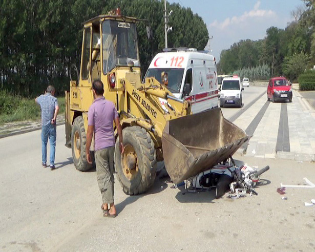Şehir merkezi istikametinden gelen ve şehir mezarlığındaki Şehitlik Camisi yönüne gitmekte olan Mehmet Çelik idaresindeki kepçe aniden dönüş yapınca, Beyköy istikametinden şehir merkezi istikametine giden Furkan Kabalar idaresindeki 81 AF 592 plakalı motosikleti altına aldı. İş makinesinin kepçesi altında kalan motosiklet sürücüsünün bacağı kırıldı. Şans eseri kepçenin önünde bulunan dişlilerden kendini kurtaran ve yaralanan sürücünün babası da olay yerine geldi. Bir yandan acı içinde bağıran ve engelli kalmaktan korktuğunu söyleyen motosiklet sürücüsü bir yandan da babasını sakinleştirmeye çalıştı.