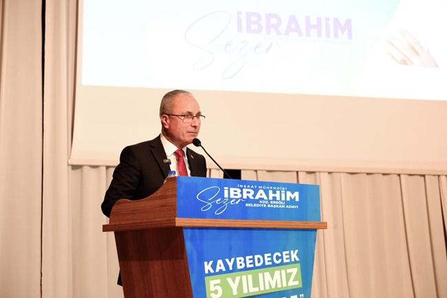 “Ben İbrahim Sezer, İnşaat mühendisiyim. 30 yıldır Kdz. Ereğli’de proje hizmetleri vermekteyim. Mesleğimden dolayı, Kdz.Ereğli’nin tüm mahalle ve sokaklarını adım adım biliyorum. Şehrimizin problemlerini ve çözümlerini bilen ekibimle, bugün sizlerin karşısında olmaktan şeref duyuyorum.