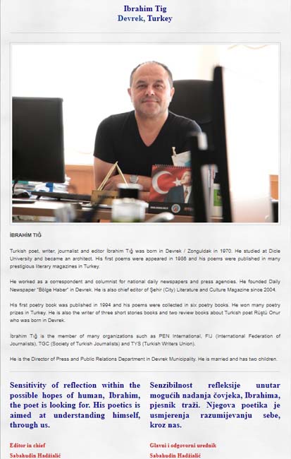 Bosnalı şair, yazar ve akademisyen Sabahudin Hadžialić ve Amerika Birleşik Devletleri'nden Peter Tase yönetiminde ABD'de pek çok dilde uluslararası yayın yapan DIOGEN pro culture magazine (edebiyat, sanat ve kültür) dergisi son sayısında şair İbrahim Tığ'ın 7 şiirine Ersin Engin'in İngilizce çevirisiyle yer verdi.