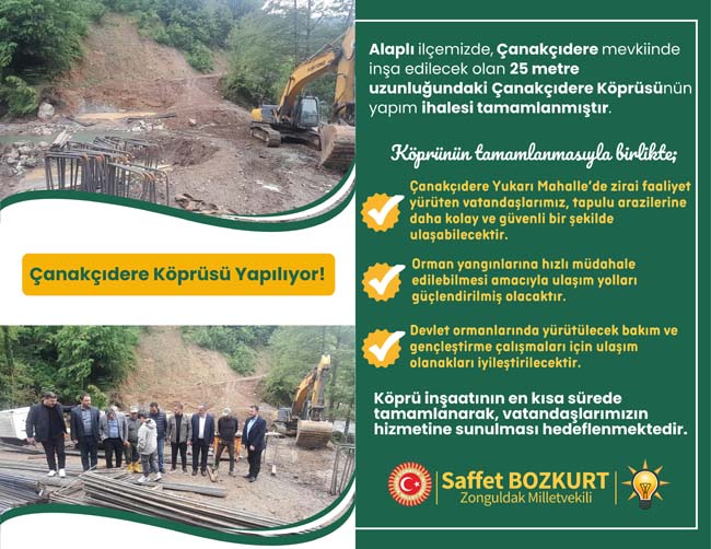 AK Parti Zonguldak Milletvekili Saffet Bozkurt, Alaplı ilçesi Çanakçıdere mevkisinde inşa edilecek 25 metre uzunluğundaki Çanakçıdere köprüsünün yapım ihalesine ilişkin açıklamada bulundu.