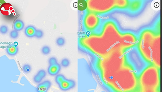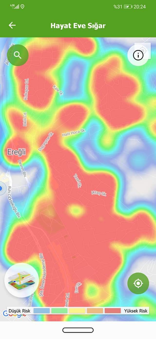 Bugün ( 22 Kasım 2020 Pazar ) “Hayat Eve Sığar” uygulaması kapsamındaki Ereğli haritasına bakıldığında yerleşim yerleri olmayan fabrika sahası, askeriye ve ormanlık alanlar dışında çok sayıda bölge tamamen kırmızıya büründü. 5 gün önceki harita ile kıyaslandığında Ereğli’de Çarşı Merkezi, Meydanbaşı ve Bağlık mahallesinde çok ciddi artışlar var. Sokak olarak ise Hatip Sokak en riskli bölge olarak göze çarpıyor. Yine 5 gün öncesine göre, Kadı Tarlası bölgesi (Akarca, Süleymanlar Mahalleleri) ve Kepez de ki artış gözle görülür seviyede. En risksiz bölgelerden biri olan kemer bölgesi de kırmızıya boyanmaya başladı..