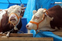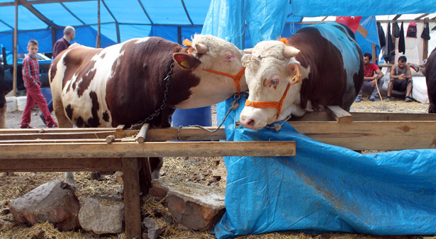 Zonguldak'ta Kurban Bayramı sebebiyle 69 Ambarları mevkisinde kurulan kurban pazarında yan yana şekilde satılan simenter cinsi ikiz danalar Paşa ve Kral ilgi odağı oldu.