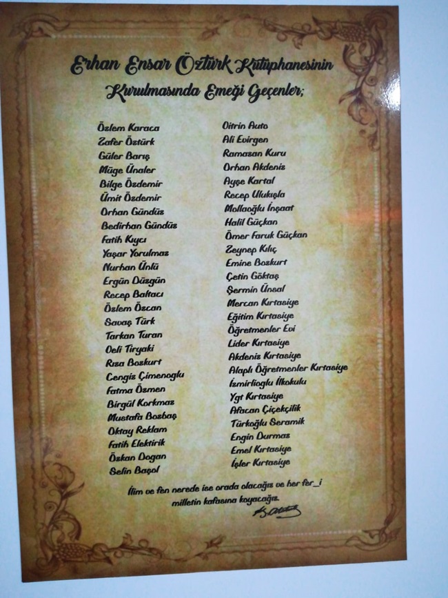 Bugün de, (dün) 21 günde çalışmalarını tamamladığımız okuldaki kütüphanemizin açılışını gerçekleştirdik. Böyle bir çalışmayı daha hayata geçirdiğimiz için arkadaşlarımızla birlikte büyük heyecan ve gurur yaşıyoruz. Projemize katkıda bulunan herkese çok teşekkür ediyoruz. Büyük Önderimiz Mustafa Kemal Atatürk’ün İlim ve fen nerde ise orada olacağız ve her fer-i milletin kafasına koyacağız’ sözünü unutmuyoruz. İmkanlarımız ölçüsünde bu tür çalışmaları sürdüreceğiz.”