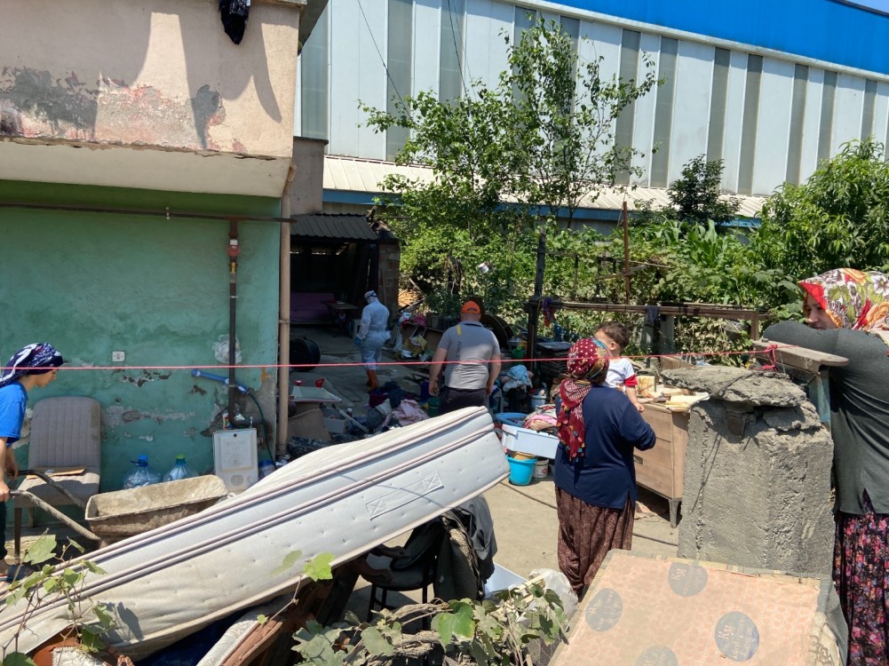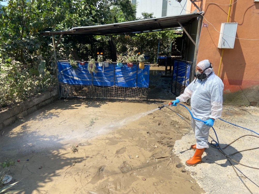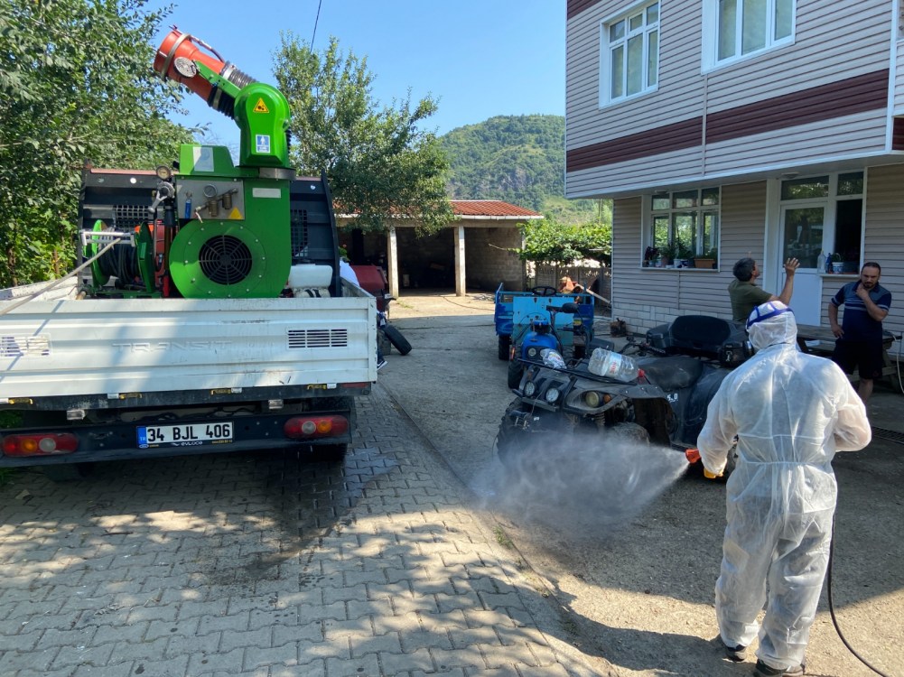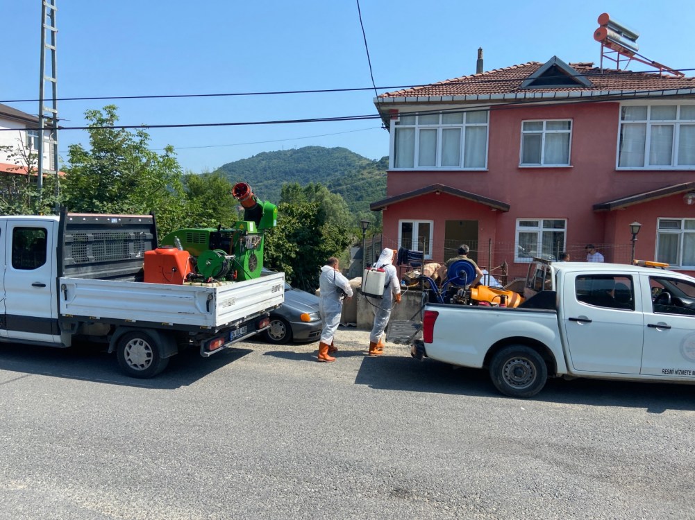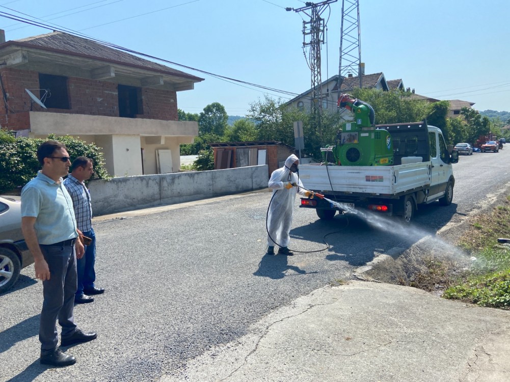 Akşam saatlerinde araç üstü ilaçlama makineleriyle yapılan sivrisinek mücadelesine ilaveten selden etkilenen vatandaşlarımızın ev, bahçe ve sokaklarında belediyemiz tarafından temizlik ve yıkama işlemlerinin yapılmasının ardından Mahalle Muhtarlarıyla koordineli olarak ilaçlama ve dezenfeksiyon çalışmaları yürütülüyor.” denildi