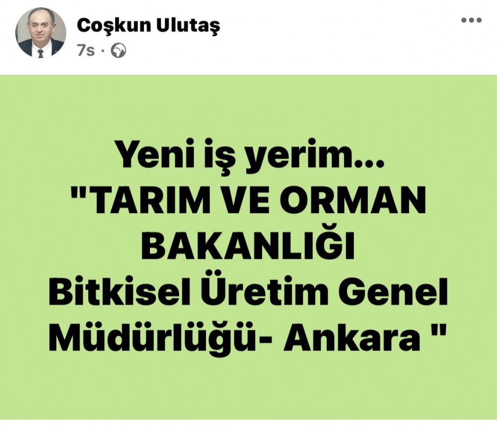 Çaycuma İlçe Tarım ve Orman Müdürü Coşkun Ulutaş'ın yeni görev yeri belli oldu. 8 yıl sonra tayini çıkan İlçe Müdürü Ulutaş sosyal medya hesabından yeni görev yerini; "Yeni işyerim, Tarım ve Orman Bakanlığı Bitkisel Üretim Genel Müdürlüğü Ankara" olarak paylaştı.