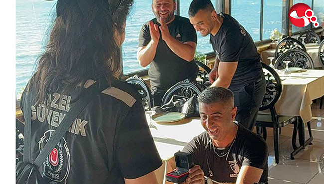 Zonguldak’ın Ereğli ilçesi Özel Güvenlik Görevlisi Cihan Barış, kız arkadaşı Nesrin Özdoğan’a mesai arkadaşlarının önünde evlenme teklifinde bulundu.