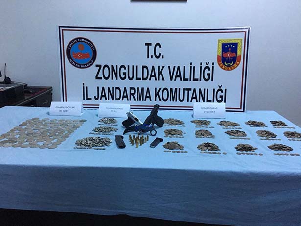 Alınan bilgiye göre, Zonguldak İl Jandarma Komutanlığı'na bağlı KOM Şube Müdürlüğü, İstihbarat Şube Müdürlüğü ve Alaplı İlçe Jandarma Komutanlığı ekiplerince ortak düzenlenen operasyon sonucunda tarihi eser niteliği taşıyan ve Kültür ve Tabiat Varlığı olduğu yetkililerce tespit edilen 90 adet Osmanlı Dönemi'ne ait gümüş sikke, 2411 adet Roma Dönemi'ne ait bronz sikke ve 385 adet Parth Dönemi'ne ait gümüş sikke ele geçirildi.