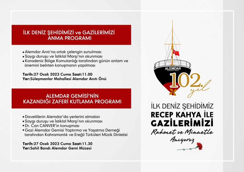 Karadeniz Ereğli Kaymakamlığı’ndan yapılan açıklamaya göre; anma programı, 27 Ocak 2023 Cuma günü 11.00’de Süleymanlar Mahallesi’nde bulunan Alemdar Anıtı önünde başlayacak. Burada, Alemdar Anıtı’na ortak çelengin sunulmasının ardından saygı duruşunda bulunulacak, İstiklal Marşı söylenecek. Karadeniz Bölge ve Garnizon Komutanlığı tarafından günün anlam ve önemini belirten konuşmanın yapılmasıyla anma programı sona erecek.