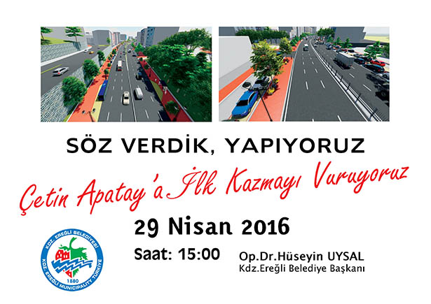 Karadeniz Ereğli'ye prestij kazandıracak vizyon projelerden biri olan 'Çetin Apatay Bulvarı Projesi'ne start veriliyor. Bulvar üzerindeki çalışmalara 29 Nisan 2016 Cuma günü saat 15:00'de düzenlenecek tören ile başlanacak.