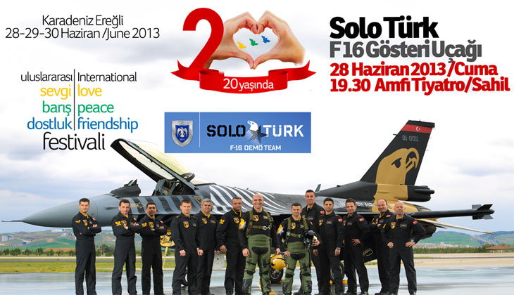 28-29-30 Haziran tarihlerinde 20. Yılını kutlayacak olan Uluslararası Sevgi Barış Dostluk Kültür ve Sanat Festivali etkinlikleri kapsamında festivalin birinci günü saat 19.00'da sahil bandında gösteri yapacak olan Türk Silahlı Kuvvetlerinin gözbebeği olan Solo Türk F-16 gösteri uçağı Türkiye'de ilk kez bir ilçede gösteri yapacak.