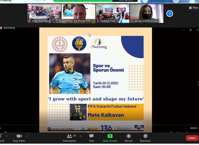 Karadeniz Ereğli’den 4 öğretmen ve öğrencilerin katılımıyla gerçekleştirilen “Sporla Büyüyüp Geleceğime Yön Veriyorum” başlıklı, 10 Türk, 2 italyan ortaklı E-twinning projesinin ilk oturumunda, hakem Mete Kalkavan, “Sporun Önemi” adında bir seminer gerçekleştirdi. Proje, Projede öğrenciler birçok spor dalını bilinçli bir şekilde yaparak ve öğrenerek hayatlarına entegre etmeyi amaçlıyor.
