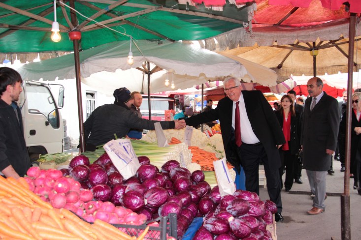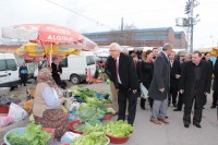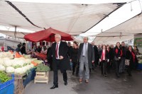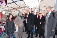 pazarında ekibiyle birlikte esnafların tek tek elini sıkıp, bol kazanç dileyen