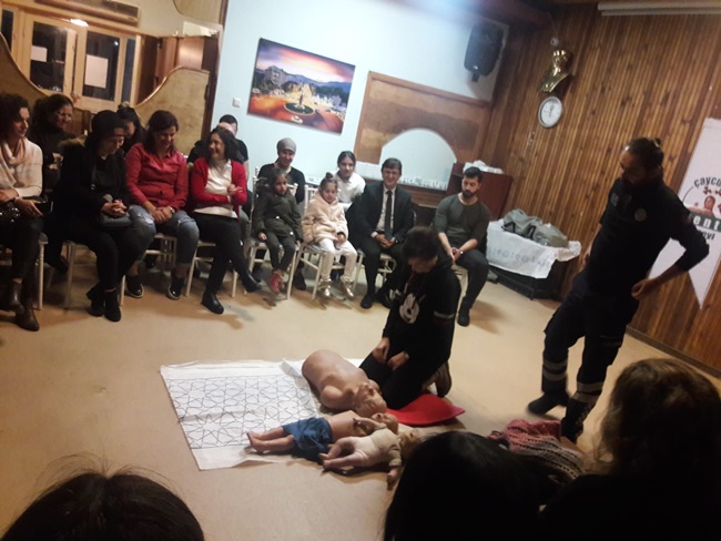 Eğitim de Koray Bayramoğlu bebek, çocuk ve yetişkinlerde meydana gelebilecek boğulma ve kazalarda sağlık görevlileri gelinceye kadar yapılması gereken ilk yardım müdahalelerini uygulamalı bir şekilde ile anlattı.