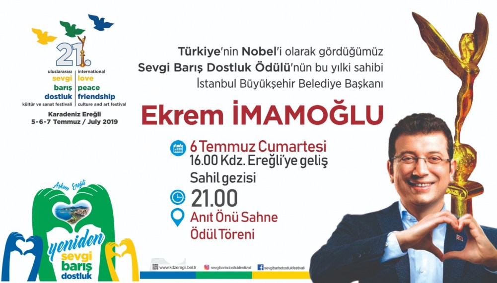 - Sevgi, Barış, Dostluk Kültür ve Sanat Festivali kapsamında verilen Sevgi, Barış, dostluk ödülünün bu yılki sahibi İBB Başkanı Ekrem İmamoğlu’nun Ereğli programı bir gün öne alındı.
