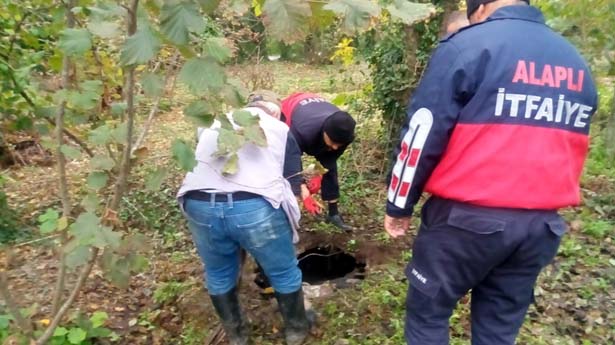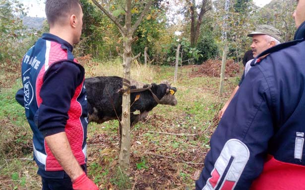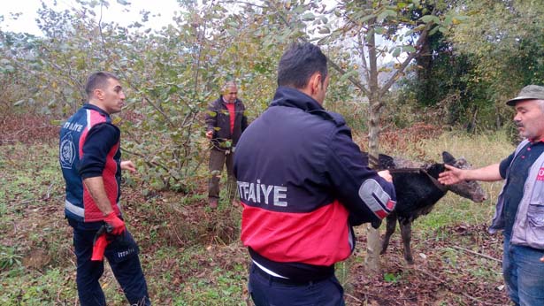 fındık tarlasında otlayan inek, yeni açılmış fosseptik çukuruna düştü. Olay yerine