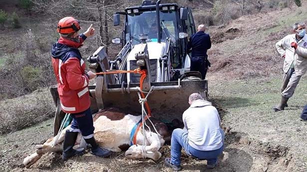 Devrek İlçesine bağlı Halilbeyoğlu Köyünde meydana gelen olayda itfaiye ekiplerinin uzun uğraşları sonucunda sarp arazide mahsur kalan inek kurtarılarak sahibine teslim edildi.