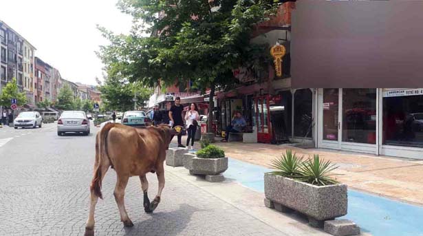 Zonguldak'ın Çaycuma ilçesinde şehir merkezine inen inek araç sürücülerini zor durumda bıraktı.