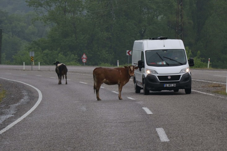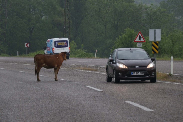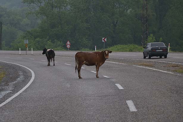 Zonguldak ile Bartın arasındaki ulaşımı sağlayan karayolu, otomobillerin yanı sıra büyükbaş hayvanları da ağırlıyor. Saltukova beldesinde yola çıkan inekler, sürücülere zor anlar yaşatıyor. Her gün onlarca büyükbaş hayvan yoldan karşıya geçiyor. Bazı büyükbaş hayvanlar ise yol ortasında dakikalarca bekliyor. Bir anda karşılarında hayvanları gören sürücüler ise ilk önce direksiyon hakimiyetini sağlamaya çalışıyor. Sürücüler daha sonra büyükbaş hayvanların yanından, araçları ile güvenli bir şekilde geçiyor.