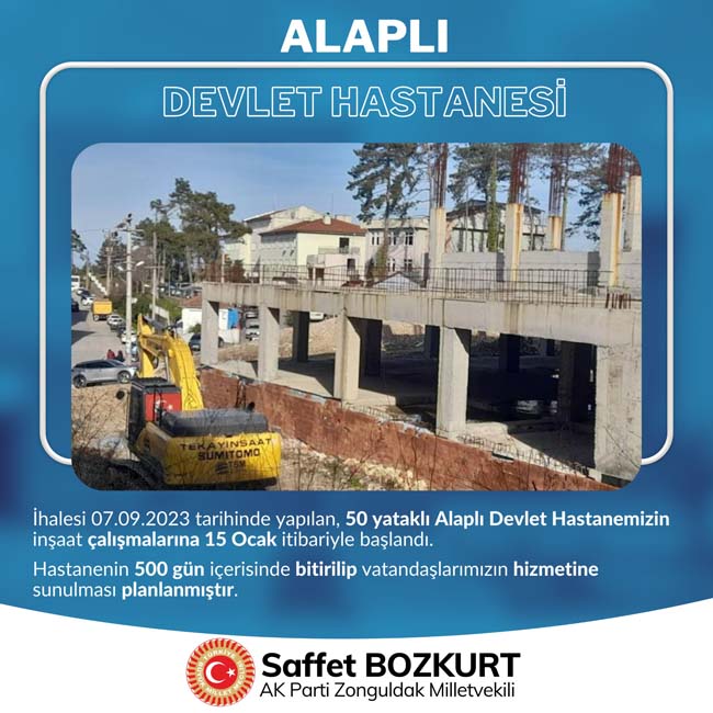 “Seçildiğimiz günden beri yoğun bir şekilde takip ettiğimiz 07.09.2023 tarihinde ihalesi yapılan, 50 yataklı Alaplı Devlet Hastanemizin inşaat çalışmalarına 15 Ocak itibariyle başlandı.