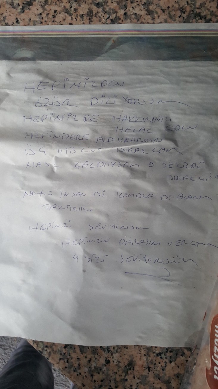 "Hepinizden özür diliyorum. Hakkınızı helal edin. Hepinize aldıklarımın üç