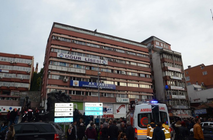 Zonguldak'ta 5 bin TL borcu olduğu öğrenilen Hakan G. (29), 8 katlı binanın çatısına çıkarak intihara kalkıştı. Binanın uç kısmına gelen genç, ayaklarını aşağıya sarkıtarak kendisine kesici aletle zarar vermeye başladı. Çevredeki vatandaşların durumu fark etmesi üzerine olay yerine gelen polis, 112, itfaiye ve AFAD ekipleri sevk edildi. Ekipler, binanın önüne branda açtı.