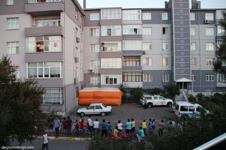 Olay ilçeye bağlı Gülüç Beldesinde Erdem Yuva evleri 21. Blok 5. katta meydana geldi. İddiaya göre uzun süredir psikolojik sorunları bulunan 2 çocuk annesi Ayşe S. (39) kayınvalidesi ile tartıştıktan sonra sinir krizi geçirdi. Eline aldığı ekmek bıçağı ile cama çıkan kadın kendisini öldüreceğini söyleyerek bağırmaya başladı. Durumun bildirilmesi üzerine olay yerine Polis, İtfaiye ve sağlık ekipleri sevk edildi. İtfaiye ekipleri evin arkasına merdivenli aracı hazırlarken, binanın ön tarafına ise hava yatağı hazırlandı. Kendisini çocukları ile birlikte eve kilitleyen Ayşe S. poşet içerisinde ekiplere not gönderdi. Notta kocasının eve gelmesini isteyen kadının isteği üzerine polis Ayşe S. nin eşi Şükrü S. yi (41) eve getirdi. Ayşe S. nin evin kapısını aşmaması üzerine eş Şükrü S. merdivenle beşinci kattaki evine camdan girdi. Şükrü S. nin eşini ikna etmesinin ardından ekipler eve girdi. Sağlık ekipleri intihar girişiminde bulunan Ayşe S. ye müdahale etti. Meraklı mahalle halkı ise olayın bitmesinin ardından evlerine dağıldı. Polis olayla ilgili tahkikat başlattı.