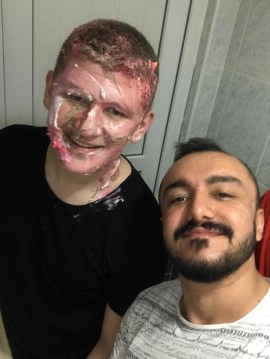 Zonguldak’ın Ereğli ilçesinde arkadaşlarının doğum gününü kutlayan ancak getirdiği pastayı doğum günü olan arkadaşlarının yüzüne yapıştıran Hayrettin Yavuz’dan mağdurlar ve mağdur arkadaşları intikam aldı. Hayrettin Yavuz’u ağaca bağlayan pasta mağdurları, özel yapılan pastayı Hayrettin Yavuz’un yüzü başta olmak üzere vücudunun her yerine sürdüler.