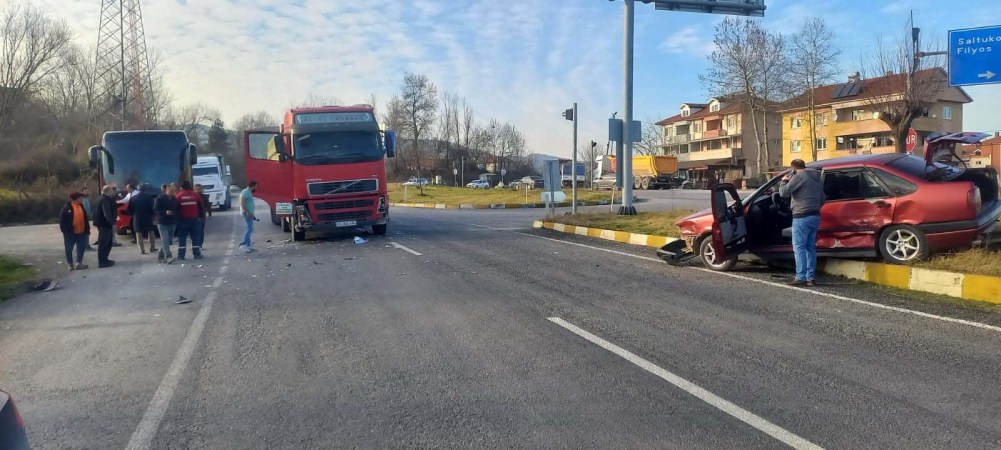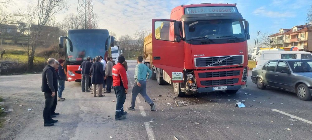 Zonguldak’ın Çaycuma ilçesinde yol kenarında duran otobüs yüzünden iş kamyon ile otomobilin çarpıştığı kazada 1 kişi yaralandı.