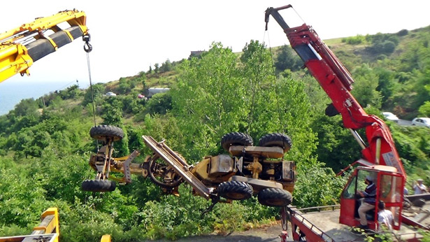 Zonguldak'ın Kilimli ilçesine bağlı Türkali köyünde geçtiğimiz hafta seyir halinde olan ve önüne büyükbaş hayvan çıkması nedeniyle yoldan çıkarak devrilen iş makinesi uçtuğu yerden 2 saat sonra çıkarıldı.
