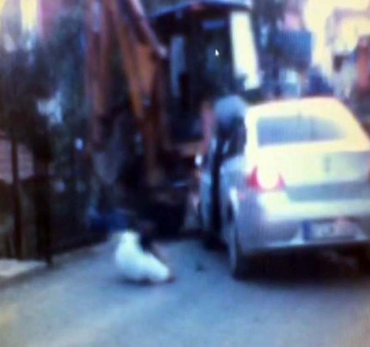 İŞ MAKİNESİ ÖNCE OTOMOBİLİNE ÇARPTI, SÜRÜCÜ EZİLMEKTEN SON ANDA KURTULDU