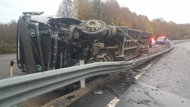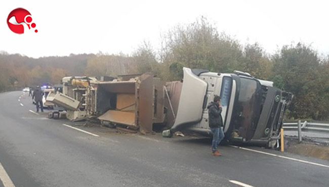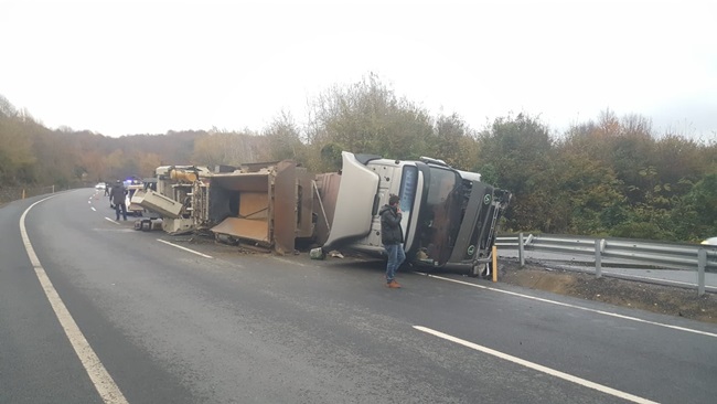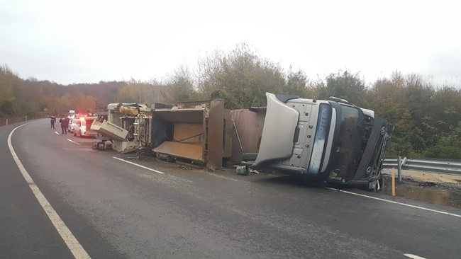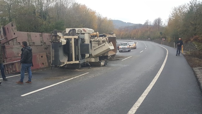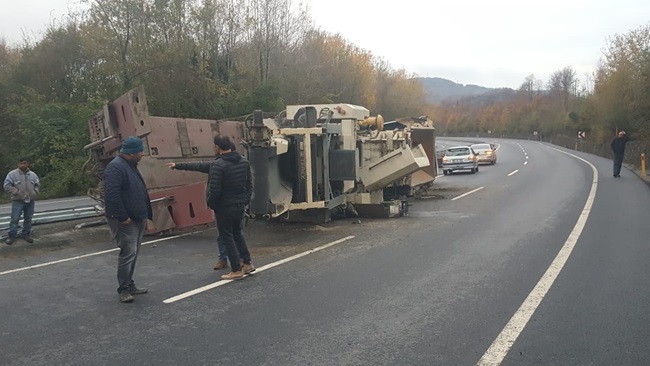 İddiaya göre Zonguldak’tan Ereğli istikametine giden Tayfun V. idaresinde ki 78 BS 505 çekici 78 ABA 139 Dorse plakalı TIR, lastiğin patlaması sonucu sürücünün direksiyon hâkimiyetini kaybetmesi sonucu devrildi. Kazayı gören vatandaşlar sağlık ve polis ekiplerine haber verildi. Olay yerin gelen 112 ekipelri sürücünün yaralı olmadığını beyan etmesi üzerine kaza yerinden ayrıldı. Kazada devrilen TIR ve iş makinesinde hasar meydana geldi. Kazadan dolayı trafik tek şeritten verilirken, TIR ve iş makinesinin yoldan kaldırılması için çalışma başlatıldığı öğrenildi.