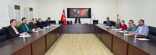 Rektörlük Senato Salonundaki toplantıda İş Sağlığı ve Güvenliği Kurul üyeleri Dr. Öğr. Üyesi Sefa Kocabaş, Prof. Dr. Nejat Demircan, Öğr. Gör. Serkan Ören, Şaziye Kayalı, Bekir Kaleli, Mehmet Kundakçıoğlu, Şenol Tasalı, Erdoğan Başar, A Sınıfı İş Güvenliği Uzmanı Olcay Yanık ve Koordinatörlük Personeli Umut Babalık yer aldı.