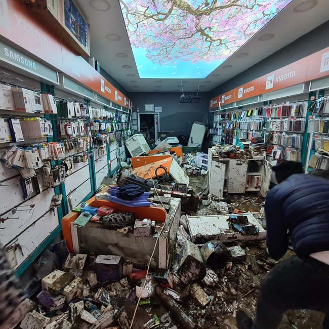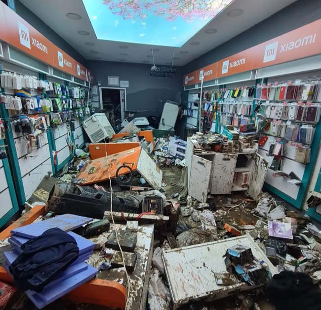 "O gün sabah saat 9 gibi fırtına başladı. Evlerimizden bile su girmeye başlamıştı. Çarşı içinde su yükselmeye başlamış, 1.5 metreyi bulmuş. Kepenk su basıncına dayanamıyor, iş yerini su basıyor. Dükkandaki her şeyi yıkıyor geçiyor. 4 milyona yakın maddi hasarım oldu. Telefonlarımız, elektronik cihazlarımız, tamir cihazlarımız zarar gördü. Devletten yardım aldık. Cam, kepenk gibi hasarları karşıladı. İçişleri Bakanımıza konuyu ilettik. Zararımız gerçekten çok büyük. Su geçirmez ürünlerimiz var. Onları piyasadan uyguna satmak zorundayız. Kimisi uygun diyor, kimisi de su gördüğü için almıyor. Almayanlar da var."
