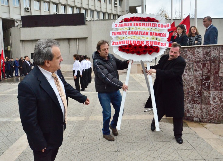 Zonguldak Valiliği önünde düzenlen törene, Türkiye Sakatlar Derneği Zonguldak Şube Başkanı Hüseyin Şirin, AK Parti İl Başkanı Zeki Tosun, Özel Eğitim Okulu Müdür ve öğretmenleri ve öğrenciler katıldı. Törende, Türkiye Sakatlar Derneği Zonguldak Şube Başkanı Hüseyin Şirin tarafından Atatürk Anıtı önüne çelenk sunuldu. Saygı duruşunda bulunulmasının ardından İşitme Engelliler İlkokulu öğrencileri tarafından işaret diliyle İstiklal Marşı okundu.